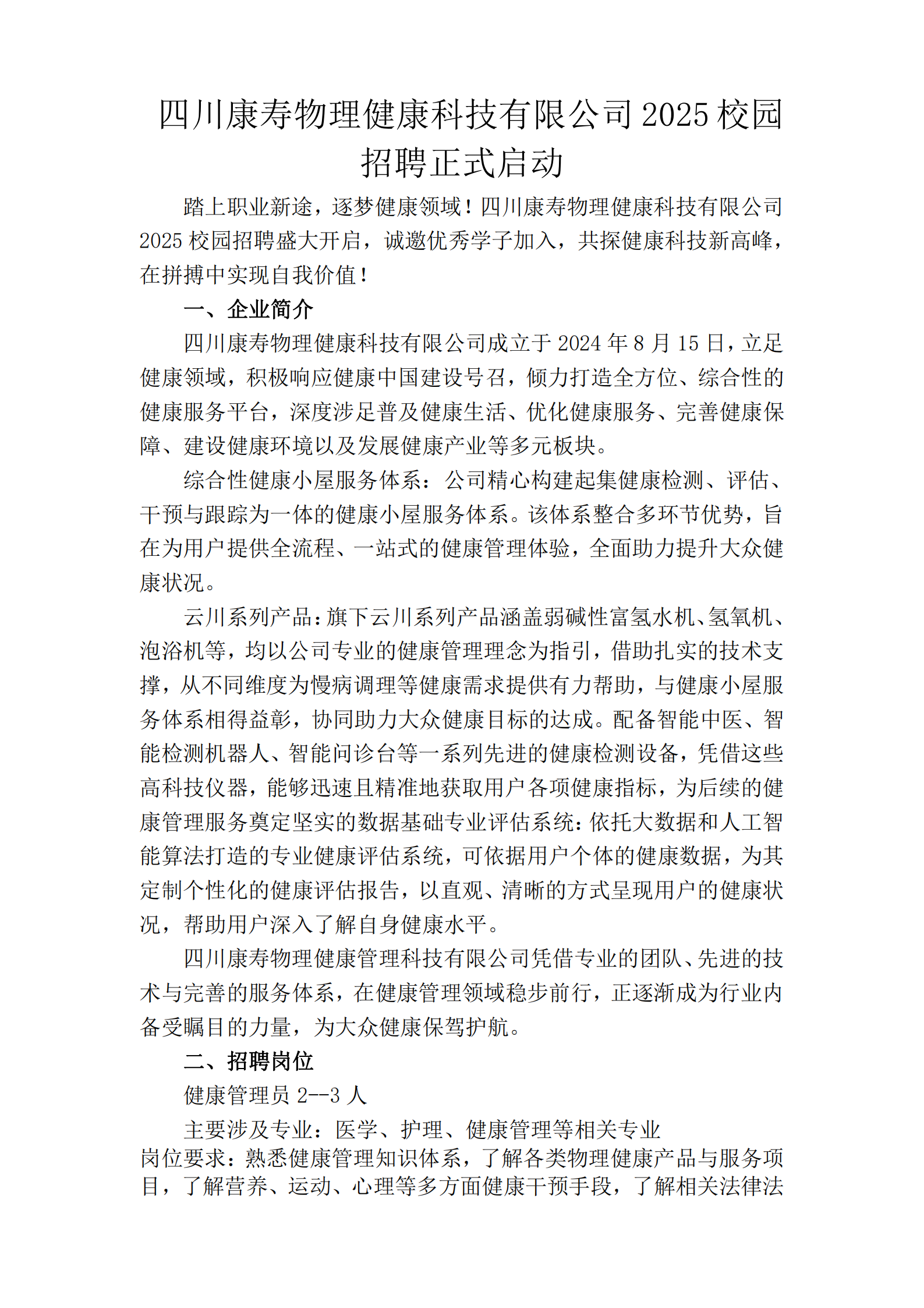 【寒假促就业暖心行动】四川康寿物理健康科技有限公司简章
