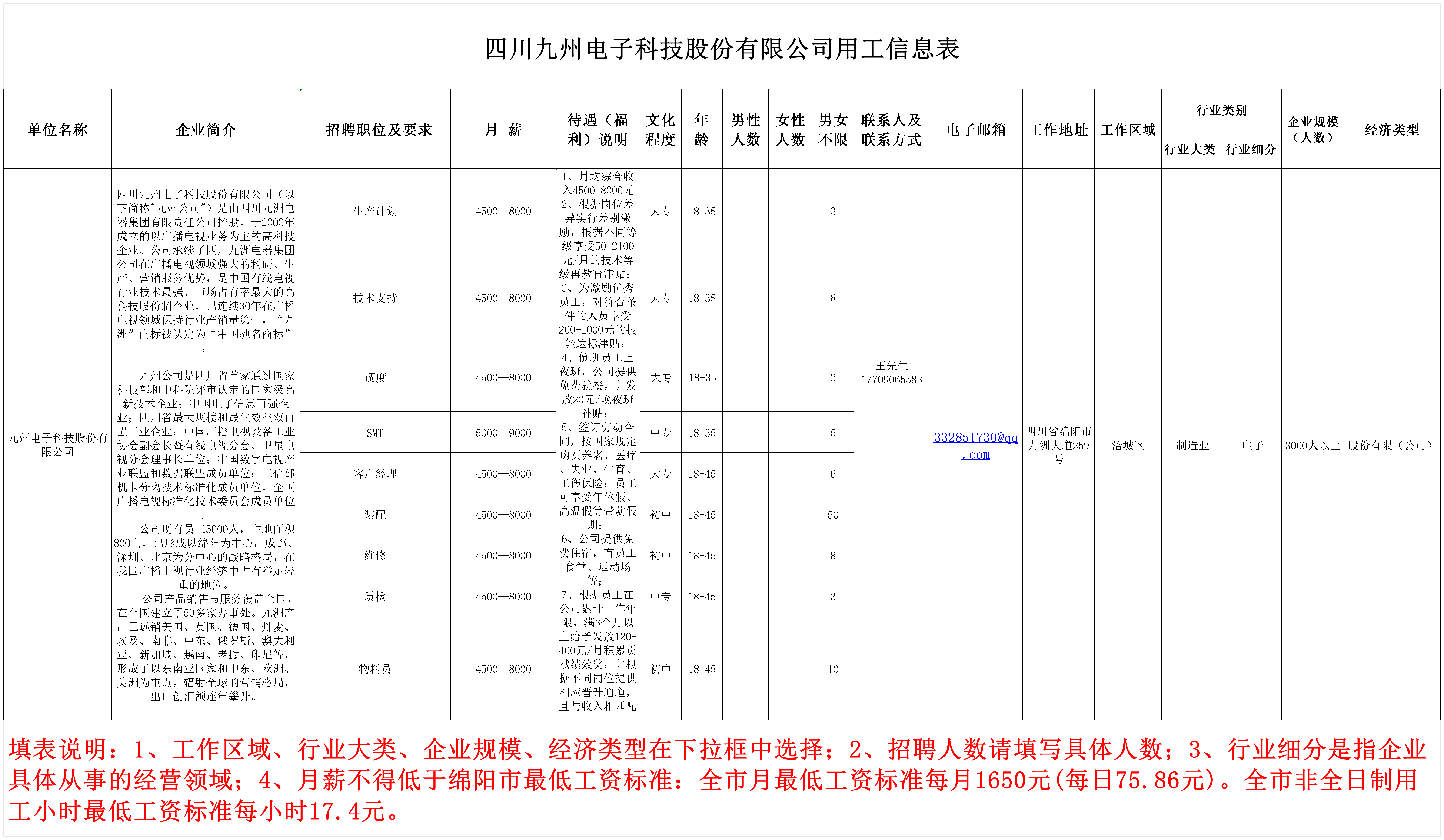 四川九州电子科技股份有限公司用工信息表